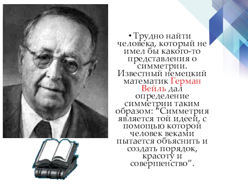 Известный немецкий математик Герман Вейль дал определение симметрии таким образом: “Симметрия является той идеей, с помощью которой человек веками пытается объяснить и создать порядок, красоту и совершенство”.