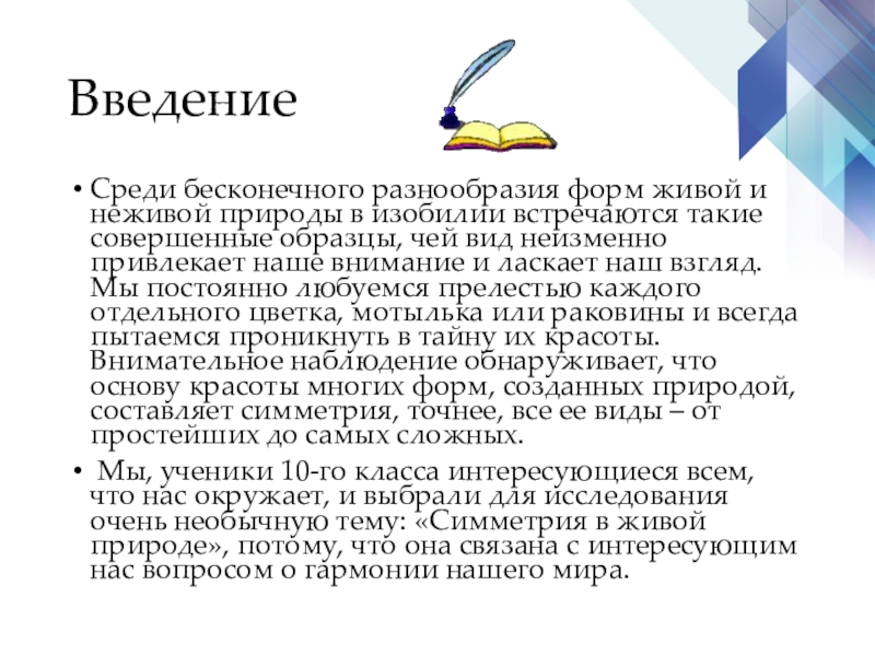 Мы, ученики 10-го класса интересующиеся всем, что нас окружает, и выбрали для исследования очень необычную тему: «Симметрия в живой природе», потому, что она связана с интересующим нас вопросом о гармонии нашего мира.