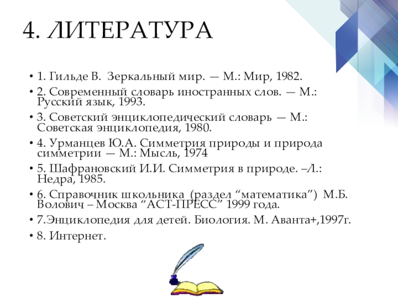 4. Урманцев Ю.А. Симметрия природы и природа симметрии — М.: Мысль, 1974
