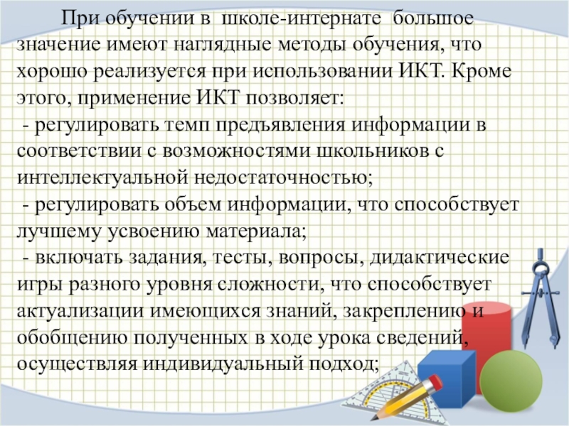 к нарушенному, многократность повторений (при изучении нового материала на уроках математики всегда идет повторение или опора на ранее изученный материал, что предполагает использование большого количества таблиц, схем и т.д., а использование ИКТ позволяет заменить их 1-2 слайдами), выполнение действий по образцу, коррекция психологических функций.