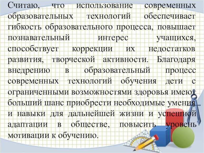 Слайд 20Считаю, что использование современных образовательных технологий обеспечивает гибкость образовательного процесса, повышает