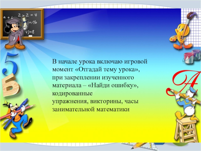 изученного материала – «Найди ошибку», кодированные упражнения, викторины, часы занимательной математики