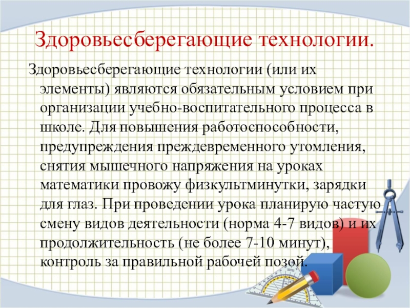 организации учебно-воспитательного процесса в школе. Для повышения работоспособности, предупреждения преждевременного утомления, снятия мышечного напряжения на уроках математики провожу физкультминутки, зарядки для глаз. При проведении урока планирую частую смену видов деятельности (норма 4-7 видов) и их продолжительность (не более 7-10 минут), контроль за правильной рабочей позой.