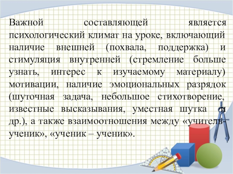 поддержка) и стимуляция внутренней (стремление больше узнать, интерес к изучаемому материалу) мотивации, наличие эмоциональных разрядок (шуточная задача, небольшое стихотворение, известные высказывания, уместная шутка и др.), а также взаимоотношения между «учитель-ученик», «ученик – ученик».