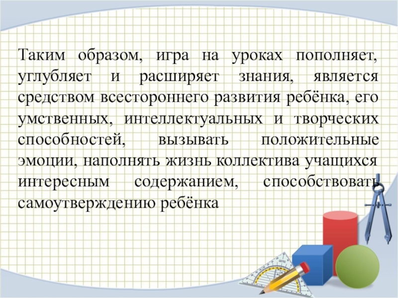 Слайд 10Таким образом, игра на уроках пополняет, углубляет и расширяет знания, является
