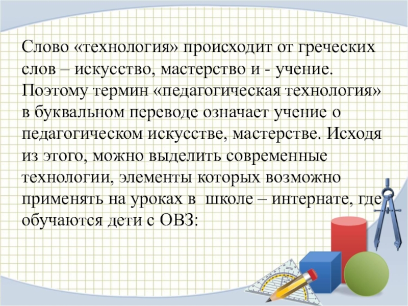 учение. Поэтому термин «педагогическая технология» в буквальном переводе означает учение о педагогическом искусстве, мастерстве. Исходя из этого, можно выделить современные технологии, элементы которых возможно применять на уроках в школе – интернате, где обучаются дети с ОВЗ: