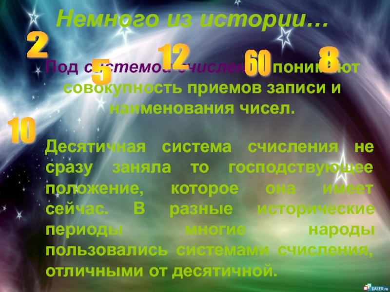 Десятичная система счисления не сразу заняла то господствующее положение, которое она имеет сейчас. В разные исторические периоды многие народы пользовались системами счисления, отличными от десятичной.