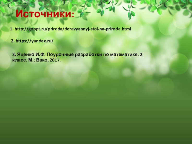1. http://goppt.ru/priroda/derevyannyj-stol-na-prirode.htmlИсточники:2. https://yandex.ru/3. Яценко И.Ф. Поурочные разработки по математике. 2 класс. М.: Вако, 2017.