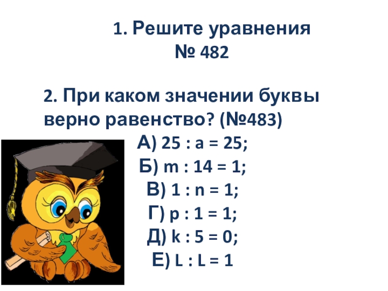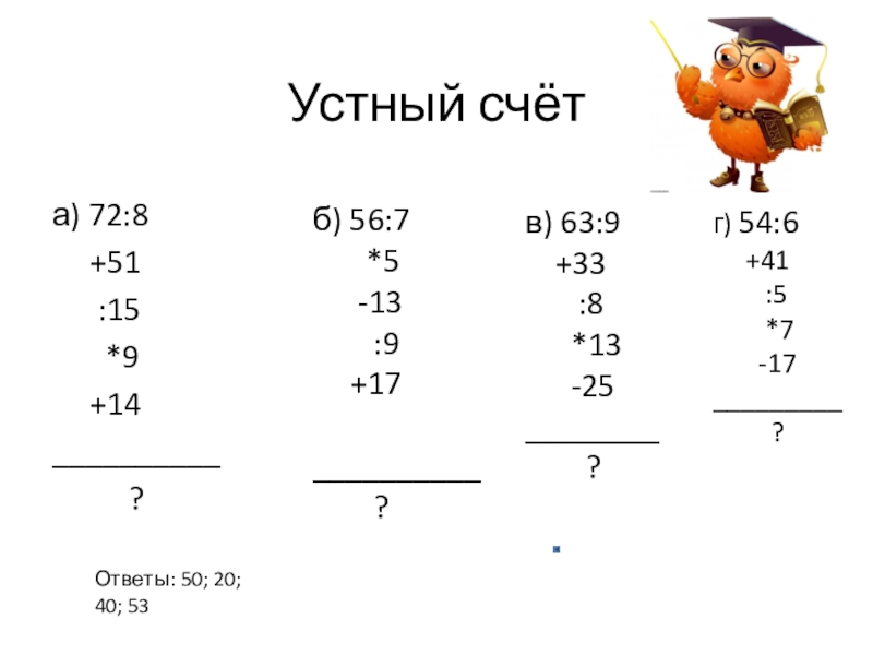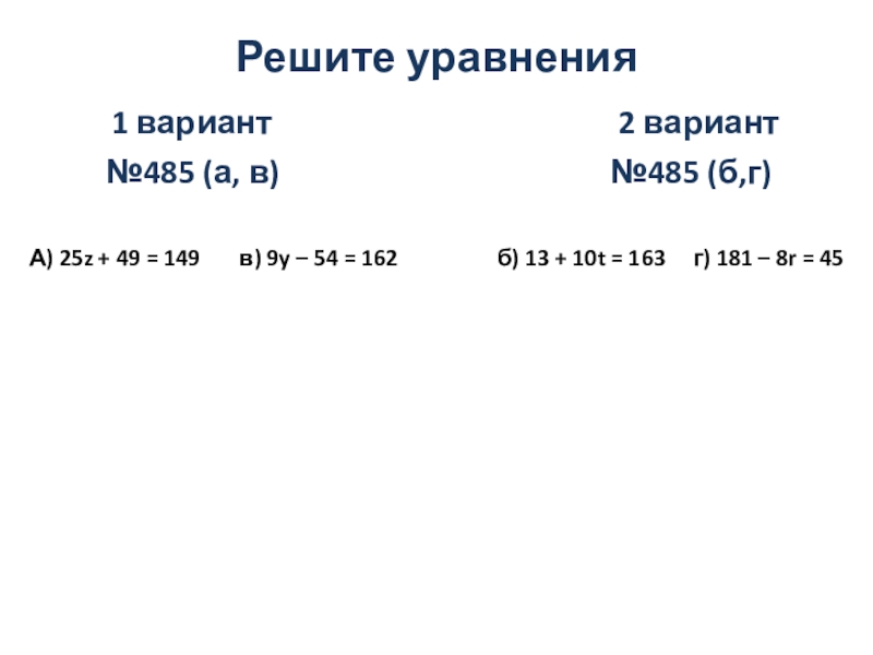 А) 25z + 49 = 149 в) 9y – 54 = 162 б) 13 + 10t = 163 г) 181 – 8r = 45