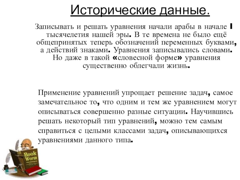 Применение уравнений упрощает решение задач, самое замечательное то, что одним и тем же уравнением могут описываться совершенно разные ситуации. Научившись решать некоторый тип уравнений, можно тем самым справиться с целыми классами задач, описывающихся уравнениями данного типа.