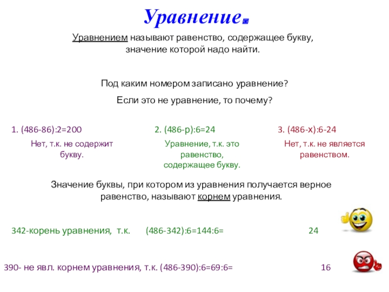 Уравнением называют равенство, содержащее букву, значение которой надо найти.