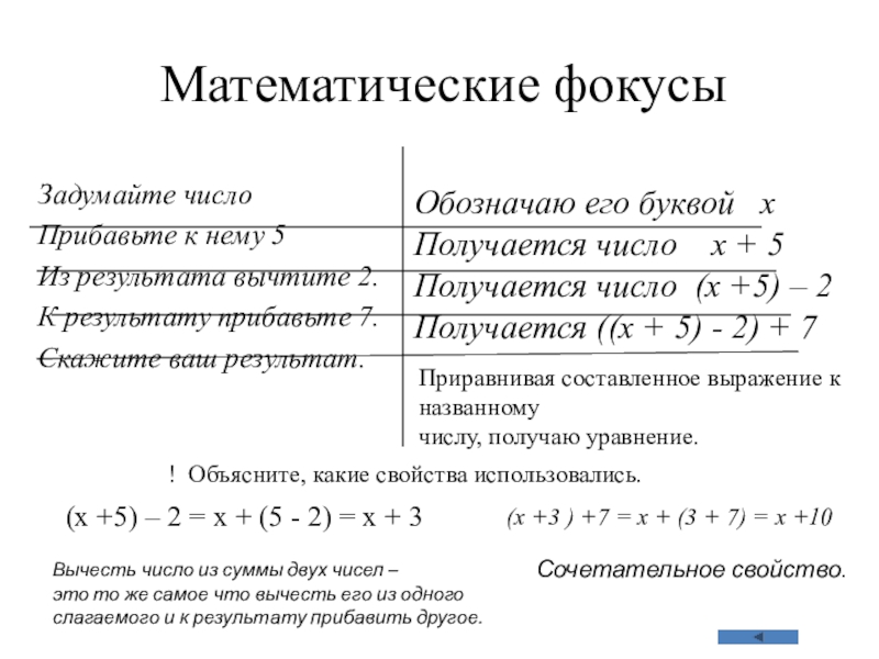 (x +5) – 2 = x + (5 - 2) = x + 3