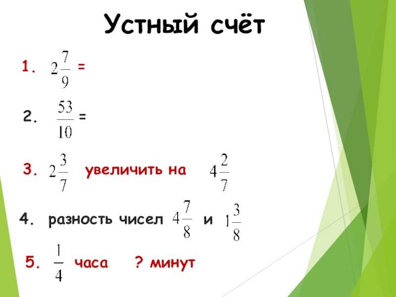 Устный счёт1.   =2.   =3.    увеличить на 4. разность чисел