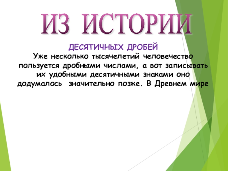 ДЕСЯТИЧНЫХ ДРОБЕЙ Уже несколько тысячелетий человечество пользуется дробными числами, а вот записывать их удобными десятичными знаками оно