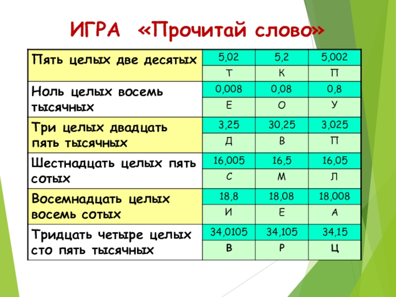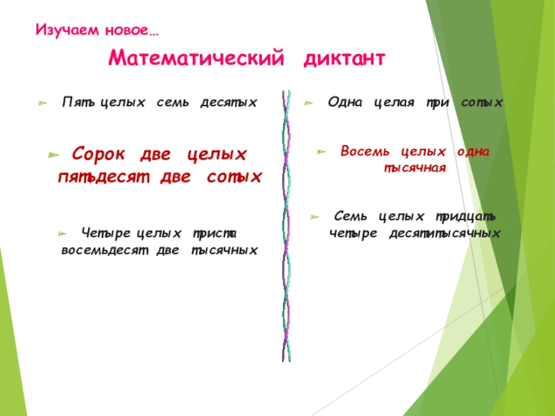 Изучаем новое…    Математический диктант Пять целых семь десятыхСорок две целых пятьдесят две сотыхЧетыре целых