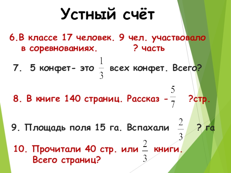 Устный счёт6.В классе 17 человек. 9 чел. участвовало  в соревнованиях.     ? часть7.