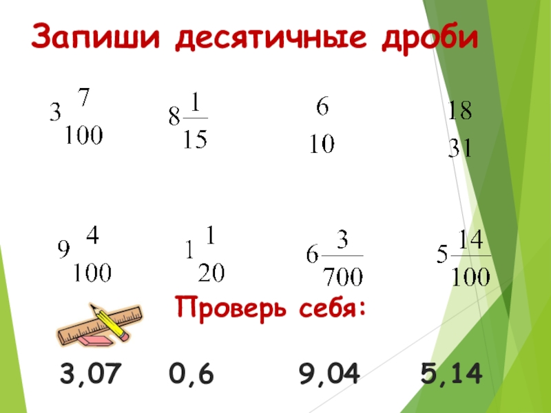 Запиши десятичные дроби Проверь себя:3,07  0,6    9,04   5,14
