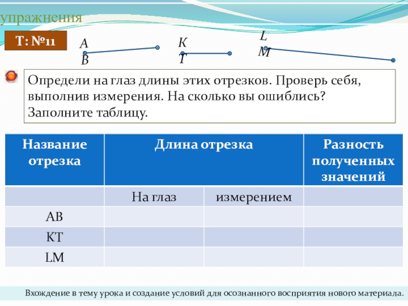 Определи на глаз длины этих отрезков. Проверь себя, выполнив измерения. На сколько вы ошиблись? Заполните таблицу.