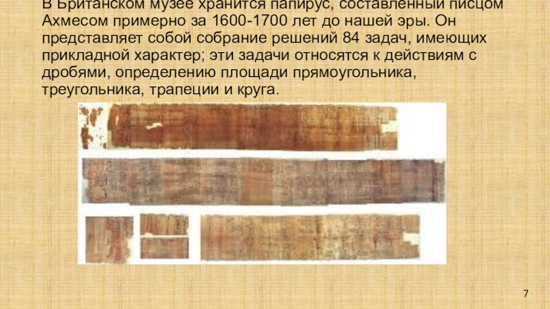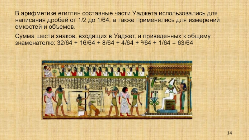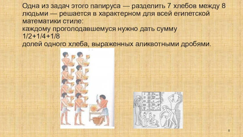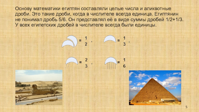 У них также были специальные символы для дробей 1/2, 2/3 и 3/4 (последние два знака — единственные используемые египтянами дроби, не являющиеся аликвотными), которыми можно было записывать также другие дроби (большие чем 1/2).