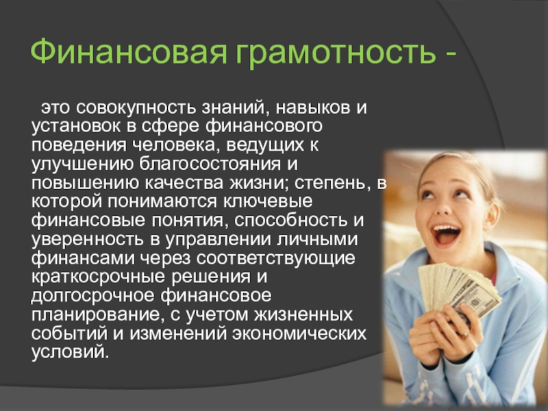 финансового поведения человека, ведущих к улучшению благосостояния и повышению качества жизни; степень, в которой понимаются ключевые финансовые понятия, способность и уверенность в управлении личными финансами через соответствующие краткосрочные решения и долгосрочное финансовое планирование, с учетом жизненных событий и изменений экономических условий.