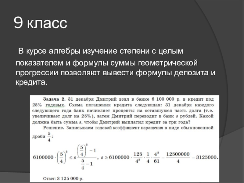 суммы геометрической прогрессии позволяют вывести формулы депозита и кредита.