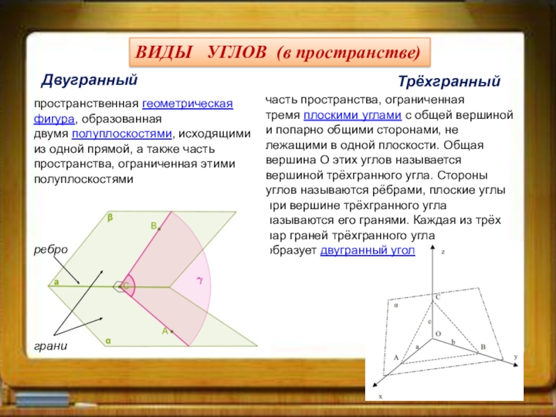 часть пространства, ограниченная тремя плоскими углами с общей вершиной и попарно общими сторонами, не лежащими в одной плоскости. Общая вершина О этих углов называется вершиной трёхгранного угла. Стороны углов называются рёбрами, плоские углы при вершине трёхгранного угла называются его гранями. Каждая из трёх пар граней трёхгранного угла образует двугранный угол