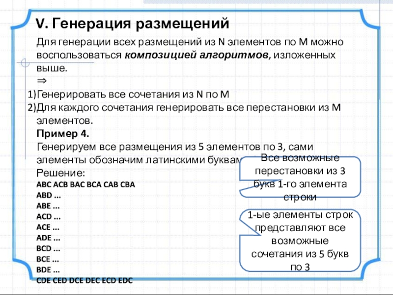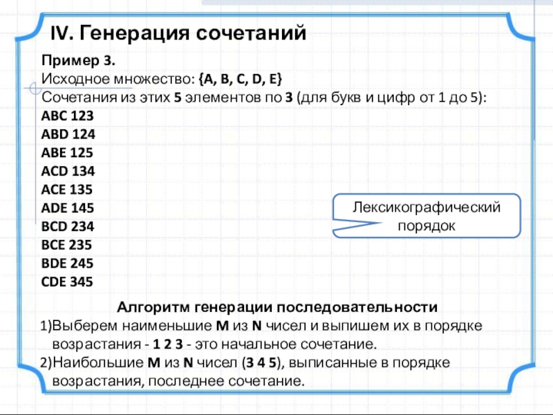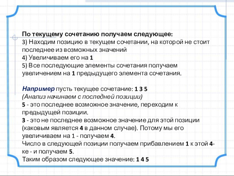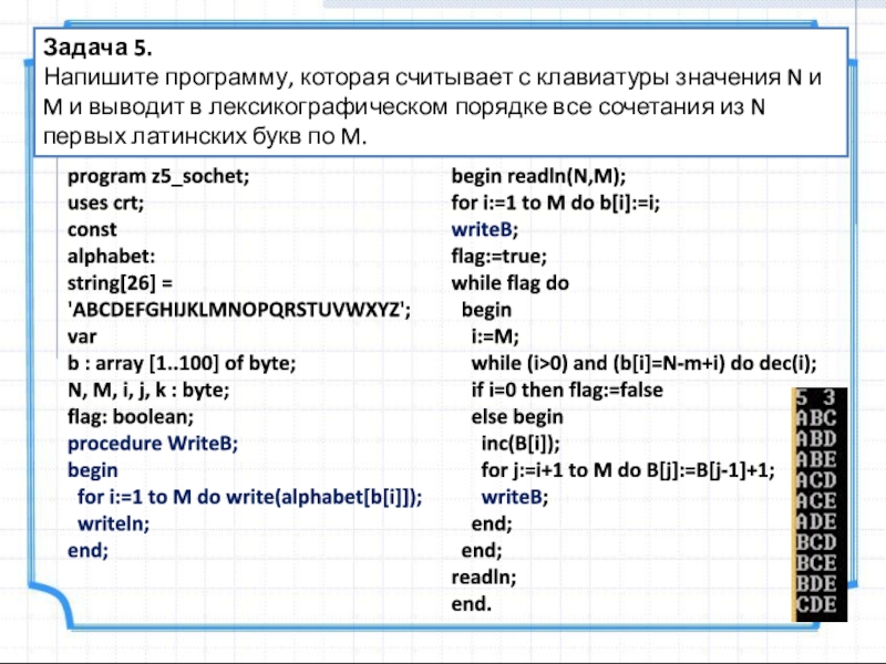 Наибольшие M из N чисел (3 4 5), выписанные в порядке возрастания, последнее сочетание.