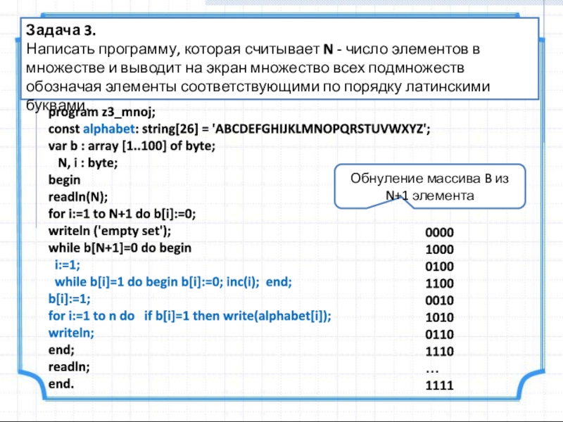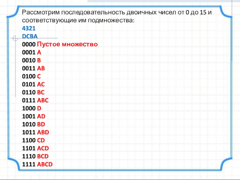 Будем считать, что значение 1 указывает на то, что соответствующий по номеру компонент исходного множества включается в множество, а значение 0 указывает на то, что элемент не включается.