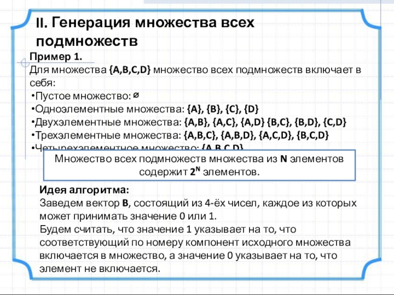 Множество всех подмножеств множества из N элементов содержит 2N элементов.