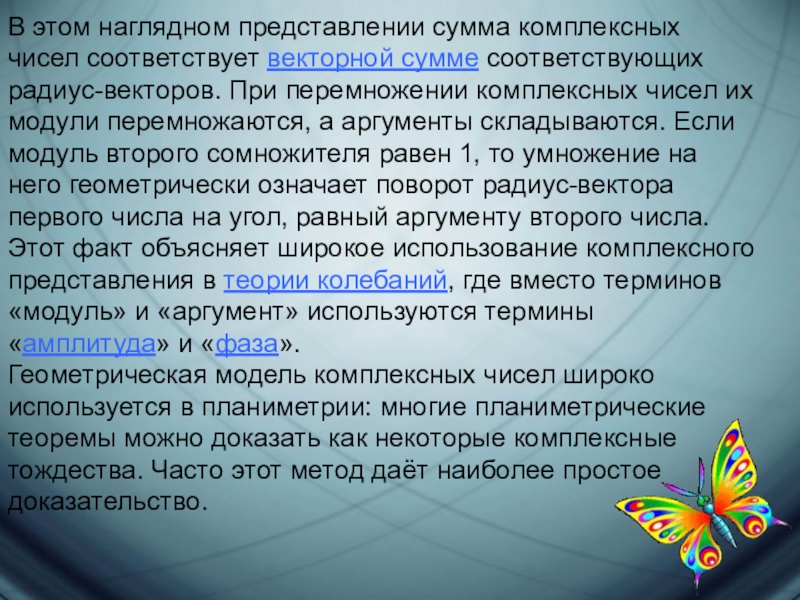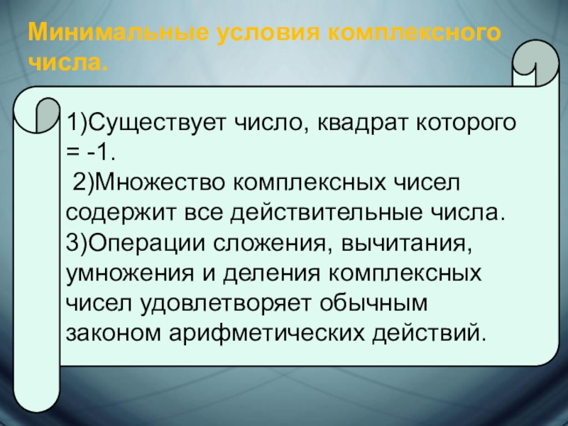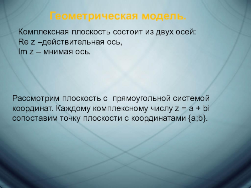Рассмотрим плоскость с прямоугольной системой координат. Каждому комплексному числу z = a + bi сопоставим точку плоскости с координатами {a;b}.