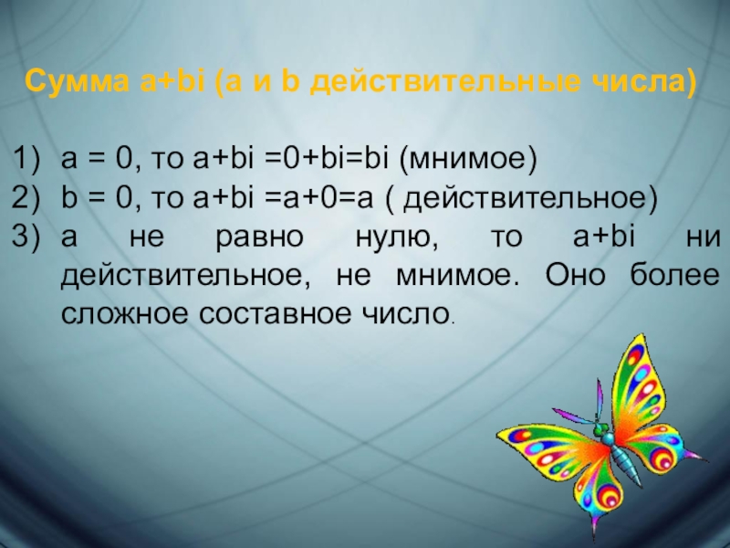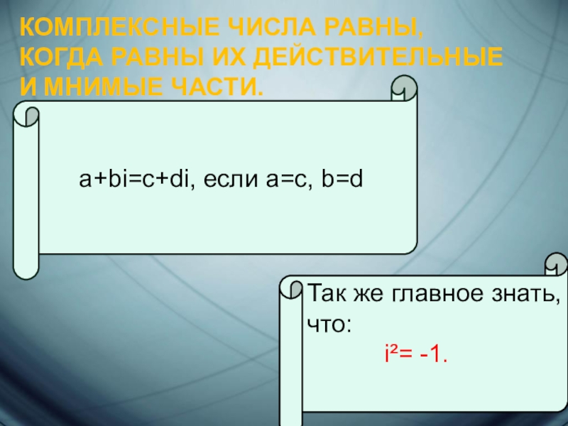 Умножение: (a + bi) • ( c + bi) = ac + bci + adi + bdi² = (ac – b d)