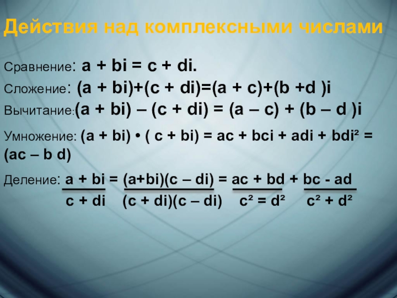 Деление: a + bi = (a+bi)(c – di) = ac + bd + bc - ad