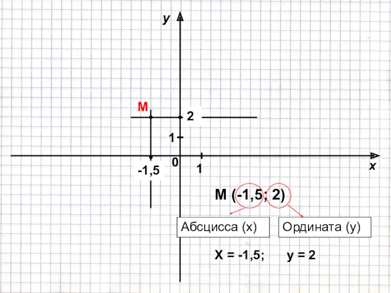 011xyM-1,52М (-1,5; 2)Ордината (y)Абсцисса (x)X = -1,5;   y = 2