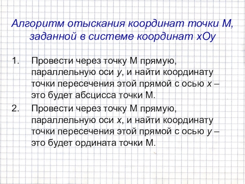 Алгоритм отыскания координат точки M, заданной в системе координат xOyПровести через точку М прямую, параллельную оси y,