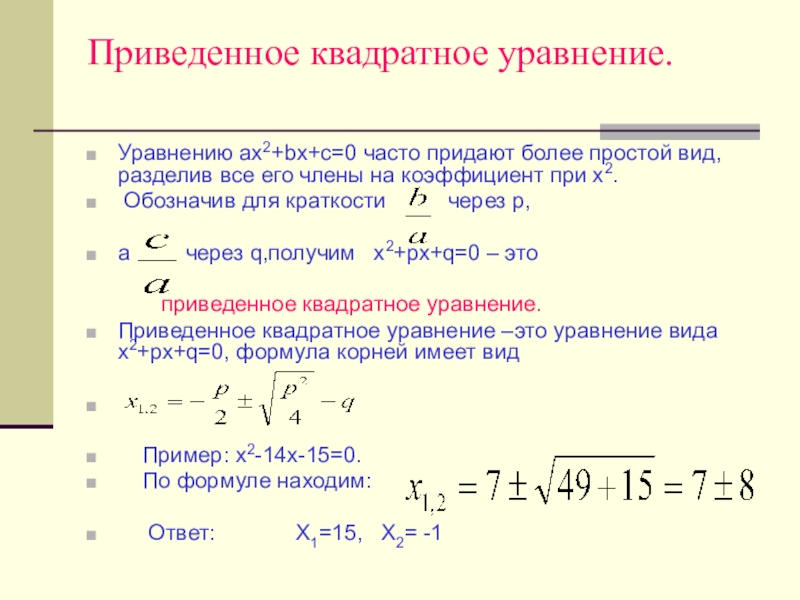 Общее правило решения квадратных уравнений, приведенных к единому каноническому вид: X2 + bx = c,
