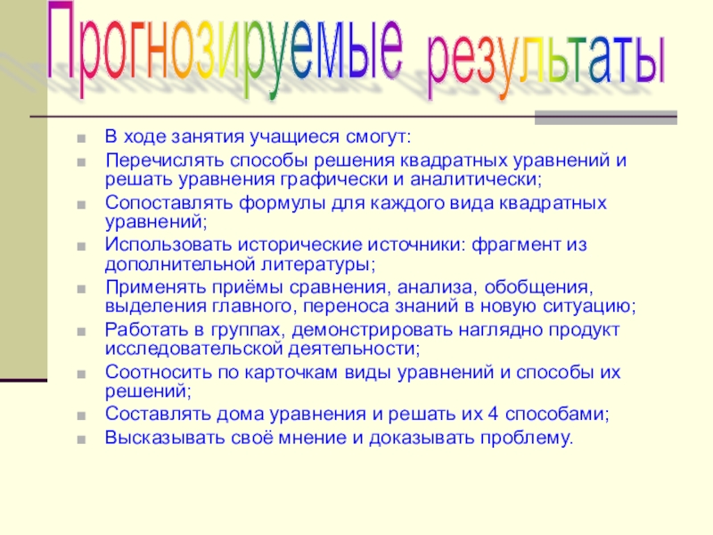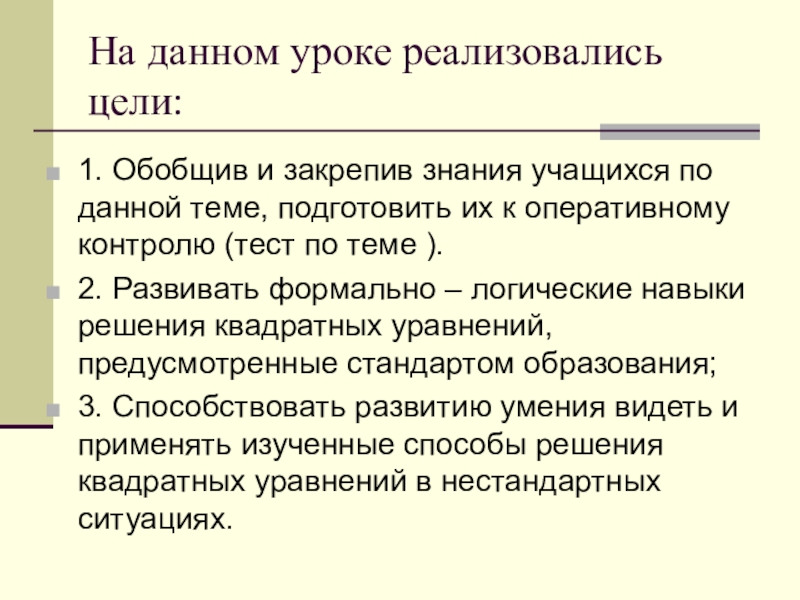 2. Развивать формально – логические навыки решения квадратных уравнений, предусмотренные стандартом образования;