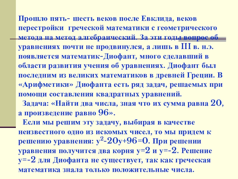 Если мы решим эту задачу, выбирая в качестве неизвестного одно из искомых чисел, то мы придем к решению уравнения: у2-20у+96=0. При решении уравнения получится два корня у=2 и у=-2. Решение у=-2 для Диофанта не существует, так как греческая математика знала только положительные числа.