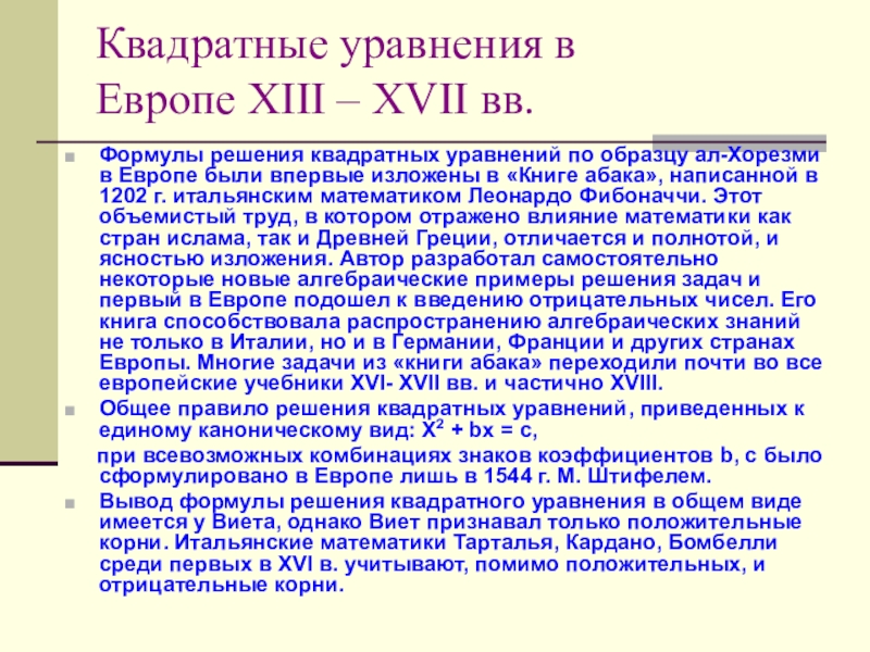 Слайд 12Квадратные уравнения в Европе XIII – XVII вв.