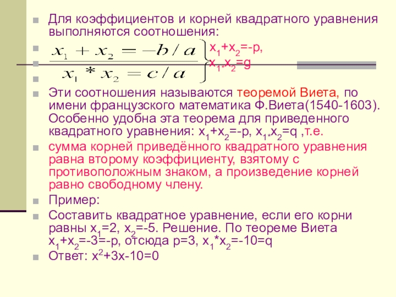 Виет сделал много открытий, но сам он больше всего ценил зависимость между корнями и коэффициентами квадратного уравнения, которая называется «теоремой Виета».