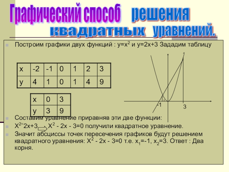Построим графики двух функций : у=х2 и у=2х+3 Зададим таблицу