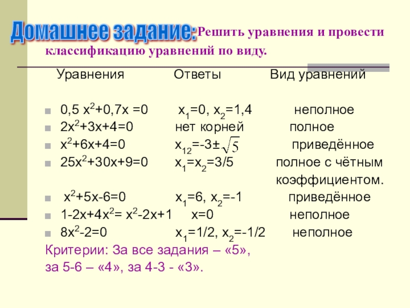 : Решить уравнения и провести классификацию уравнений по виду.