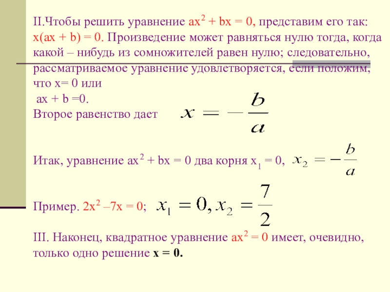 Слайд 24II.Чтобы решить уравнение ax2 + bx = 0, представим его так: