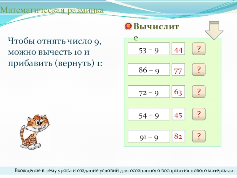 Чтобы отнять число 9, можно вычесть 10 и прибавить (вернуть) 1: