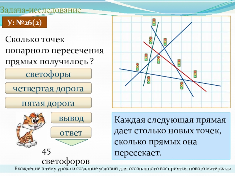 Каждая следующая прямая дает столько новых точек, сколько прямых она пересекает.