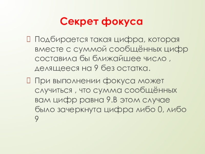 При выполнении фокуса может случиться , что сумма сообщённых вам цифр равна 9.В этом случае было зачеркнута цифра либо 0, либо 9