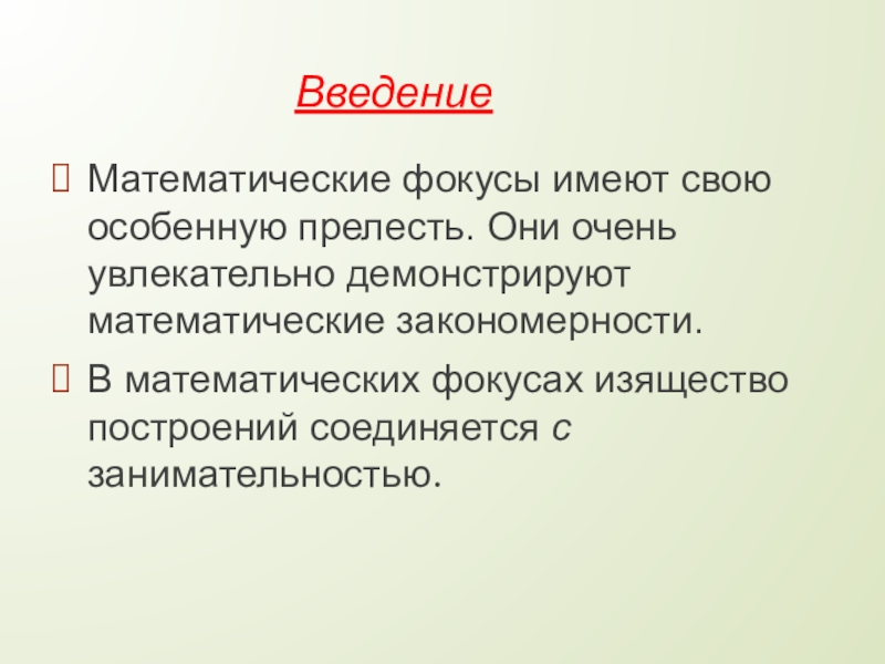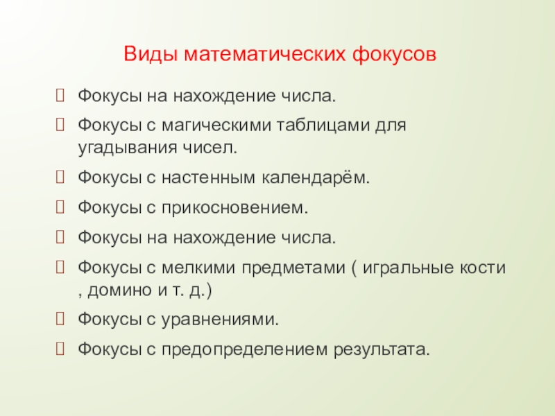 Слайд 5Виды математических фокусов
