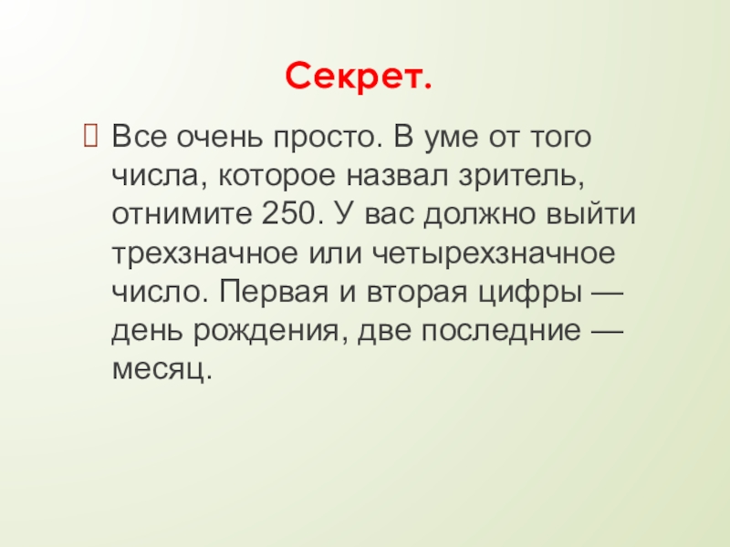 числа, которое назвал зритель, отнимите 250. У вас должно выйти трехзначное или четырехзначное число. Первая и вторая цифры — день рождения, две последние — месяц.
