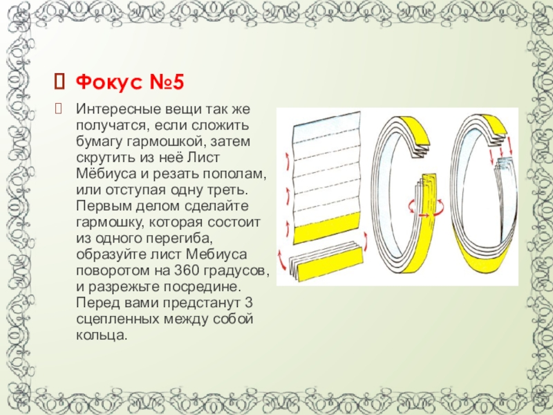 скрутить из неё Лист Мёбиуса и резать пополам, или отступая одну треть. Первым делом сделайте гармошку, которая состоит из одного перегиба, образуйте лист Мебиуса поворотом на 360 градусов, и разрежьте посредине. Перед вами предстанут 3 сцепленных между собой кольца.