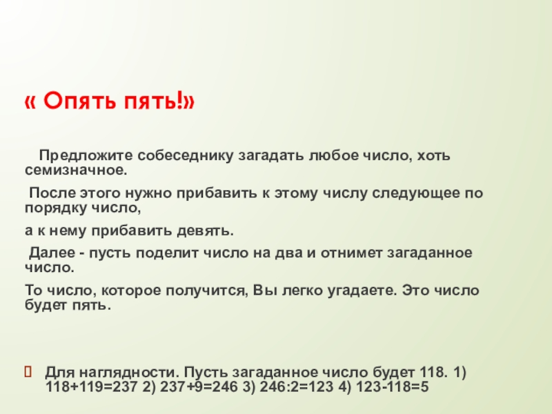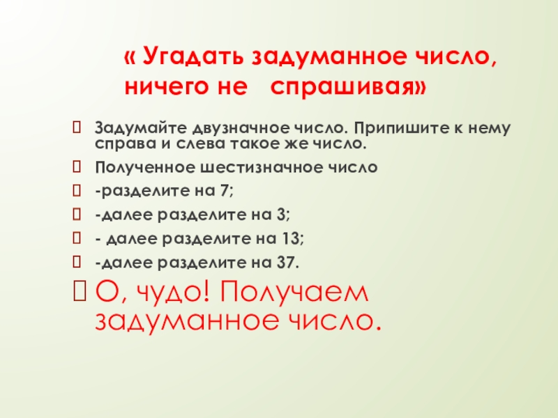 Слайд 21« Угадать задуманное число, ничего не спрашивая»