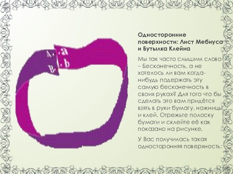– Бесконечность, а не хотелось ли вам когда- нибудь подержать эту самую бесконечность в своих руках? Для того что бы сделать это вам придётся взять в руки бумагу, ножницы и клей. Отрежьте полоску бумаги и склейте её как показано на рисунке.